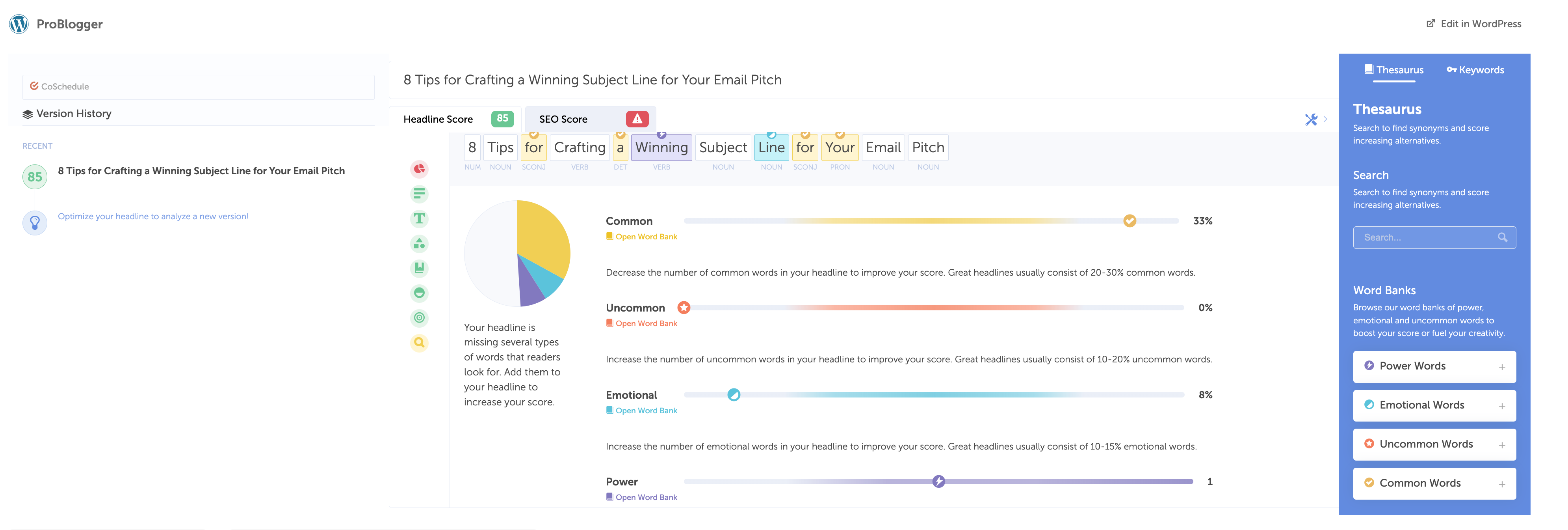 Chez ProBlogger, nous faisons tout ce qui précède, puis exécutons notre ligne d'objet d'e-mail via Headline Studio de CoSchedule pour obtenir un score et des suggestions exploitables qui vous indiquent EXACTEMENT comment améliorer vos lignes d'objet. L'exemple ci-dessous montre l'utilité de cet outil d'analyse.