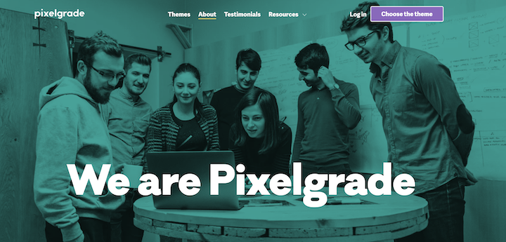 Pixelgrade prend une seule couleur et l'utilise de manière différente pour chaque section de la page. D'abord comme superposition d'arrière-plan pour son image de couverture, puis comme arrière-plan de texte uni, et enfin comme superposition découpée sur les images de leur équipe. C'est simple d'une part, et super avant-gardiste d'autre part.