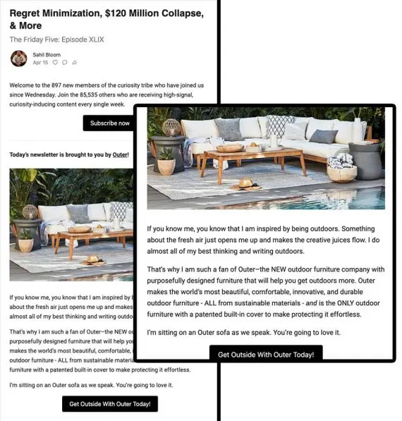 La marque de mobilier d'extérieur Outer investit dans des emplacements de newsletter. Par exemple, la société est récemment apparue dans la newsletter The Curiosity Chronicle de Sahil Bloom.