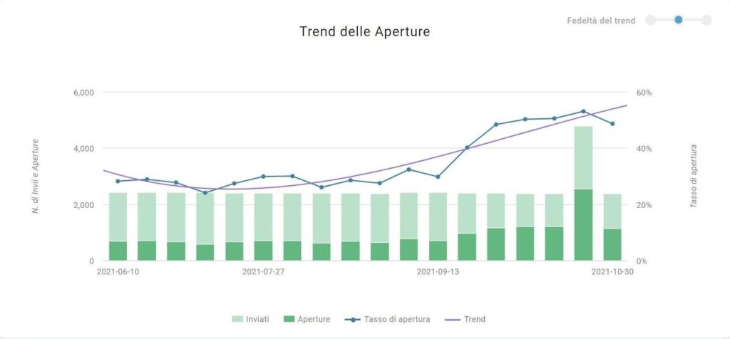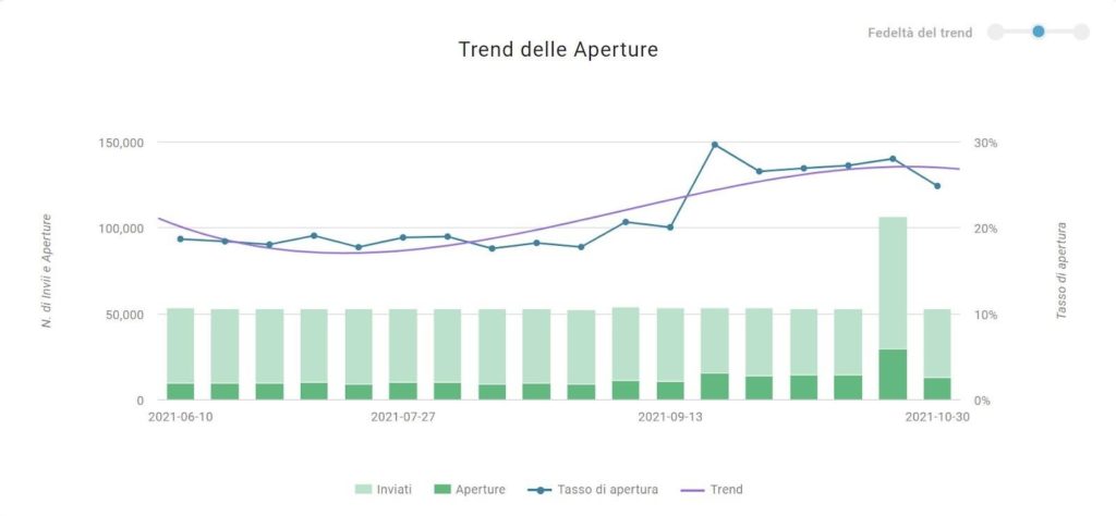 Nous avons surveillé l'impact possible de la protection de la confidentialité du courrier d'Apple en effectuant diverses analyses pour saisir l'étendue de ce changement sur les activités de suivi des données. Les volumes d'envois quotidiens et globaux de la clientèle MailUp nous ont servi de référence.
