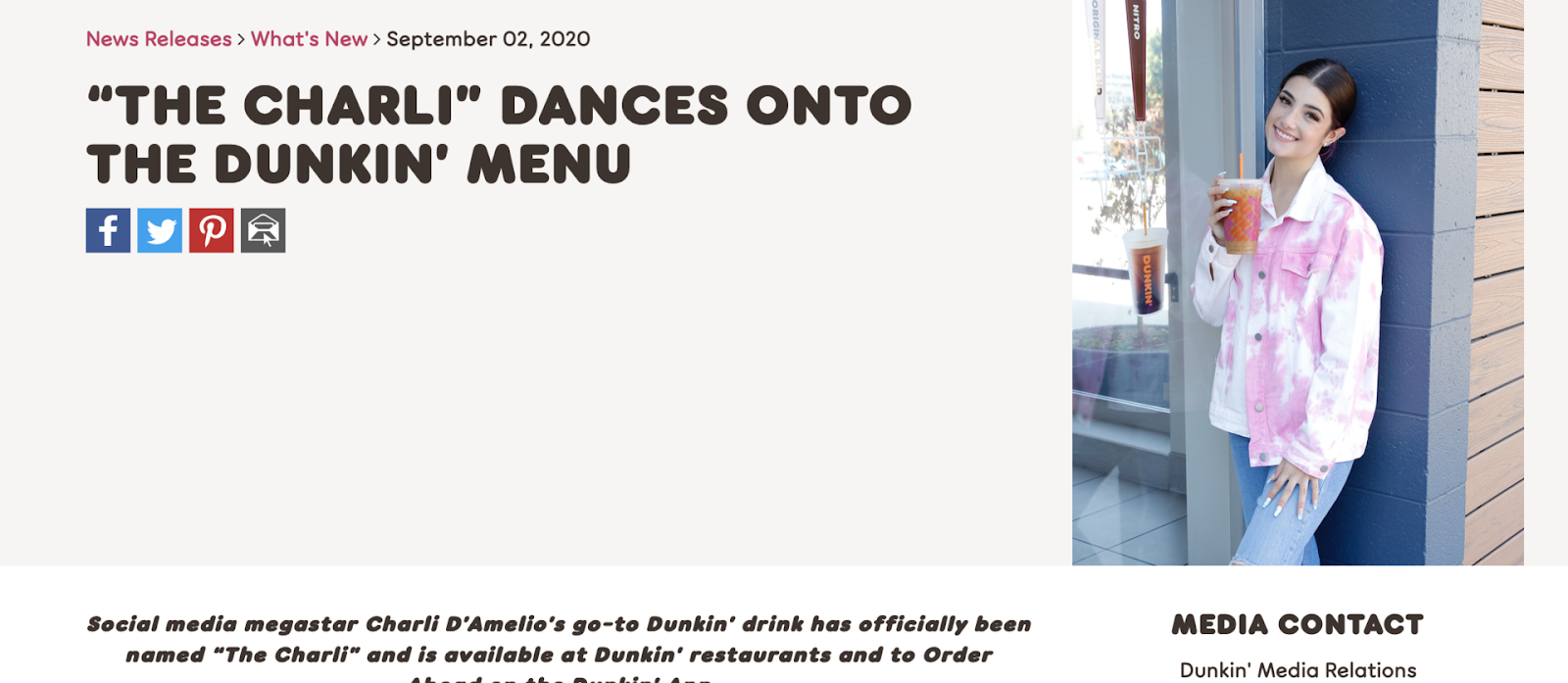 Pour adoucir la campagne déjà sucrée, Dunkin 'a ajouté des incitations telles que des points DD Perks supplémentaires pour les fans qui commandent la boisson sur leur application et même une opportunité pour les fans de partager un verre avec le danseur. Elle a également repris les réseaux sociaux de l'entreprise. N'oubliez pas cela lorsque vous réfléchissez à la manière de connecter les fans à vos produits ou services.