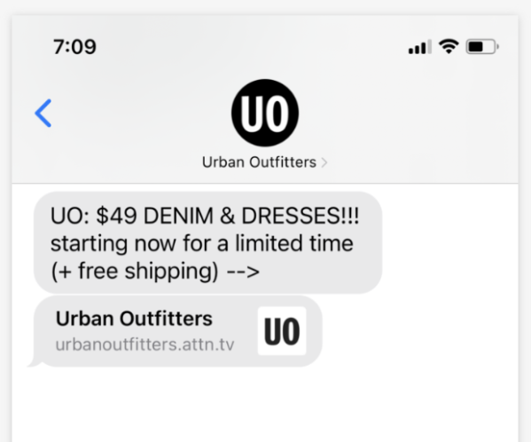 SMS, abréviation de "service de messages courts", est un texte composé de 160 caractères maximum. Souvent, vous recevrez ces SMS de votre opérateur de téléphonie mobile. Parfois, une entreprise aura accès à des numéros de téléphone et utilisera des SMS pour une sensibilisation ciblée. L'une des meilleures campagnes de marketing par SMS provient d'Urban Outfitters, le magasin branché de vêtements et d'articles pour la maison.