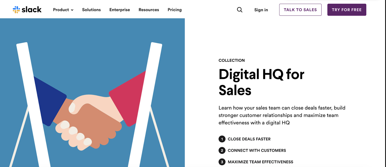 Au lieu d'envoyer des clients potentiels vers votre site Web principal et de les forcer à naviguer (ils ne le feront pas), envisagez de créer une page de destination distincte pour tout ce que vous souhaitez spécifiquement offrir. Slack, une société de logiciels utilisée pour la communication interne des entreprises, le fait particulièrement bien.