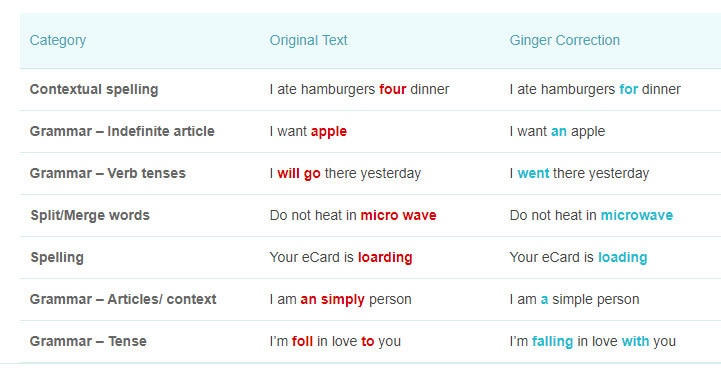 La plupart des erreurs trouvées sont des fautes d'orthographe importantes, des fautes de frappe, des erreurs phonétiques et des mots mal utilisés. Utiliser la mauvaise forme plurielle ou singulière d'un mot spécifique ou ajouter le mauvais temps sont des exemples d' erreurs grammaticales typiques .