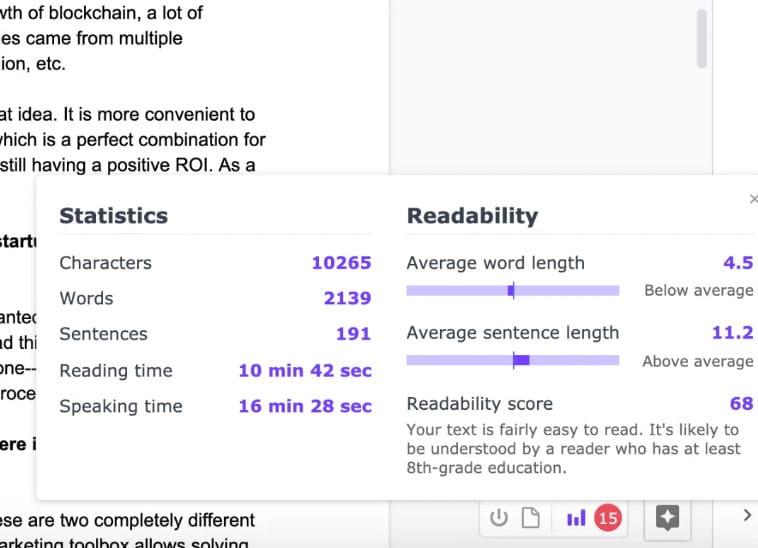 Vous pouvez également afficher et analyser des statistiques spécifiques à votre audience via l'application Web de Linguix . Ces informations peuvent vous aider à trouver le bon contenu pour les personnes que vous essayez d'atteindre. Linguix affichera votre score global de lisibilité, le temps de lecture, la longueur moyenne des mots et le nombre de mots.