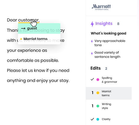 Votre propre terminologie et vos propres messages sont la base des correctifs de Writer. Cela aide à établir un ton uniforme dans l'écriture créé par tout le monde dans votre organisation. L'écriture de votre équipe est améliorée par des corrections d'orthographe, de grammaire, de clarté et de vocabulaire.