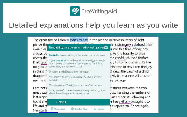 ProWritingAid peut vous aider à améliorer vos compétences en anglais et en rédaction. C'est un éditeur de style, un vérificateur de grammaire, un vérificateur de plagiat et un outil d'édition. ProWritingAid peut vous aider à vous sentir plus sûr de vous et de votre écriture. Cela peut simplifier la présentation de votre travail en servant de coach d'écriture ou de mentor personnel.
