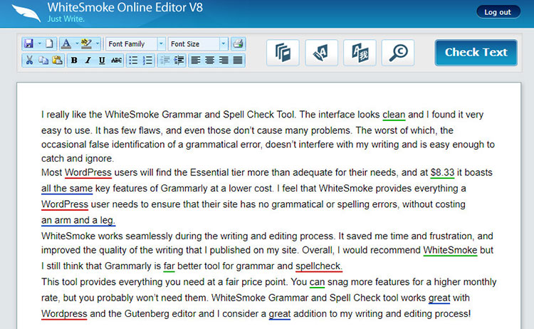 WhiteSmoke est livré avec un outil de vérification grammaticale pratique qui peut être utilisé pour trouver toutes les erreurs dans votre contenu. L'outil vous montrera les corrections possibles pour les erreurs qui ont été localisées.