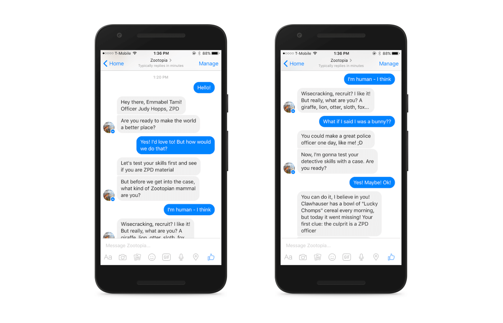 Un bon exemple de chatbot de divertissement réussi a été lancé par Disney, dans le cadre de la campagne marketing de l'un de leurs films, Zootopia. Il était disponible sur Facebook Messenger et offrait aux utilisateurs une balade amusante, résolvant des crimes avec le protagoniste, le lapin Judy Hopps. À l'époque, la technologie n'était pas encore si avancée, donc la conversation n'était pas parfaite, mais c'était quand même amusant et cool.
