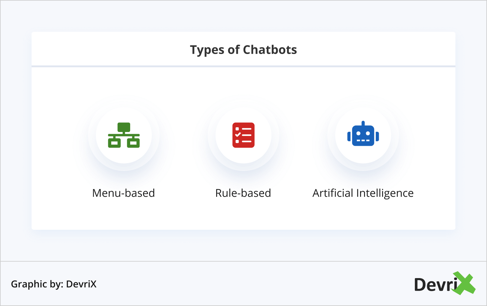 Il existe trois principaux types de chatbots - basés sur des menus, basés sur des règles et intelligence artificielle (IA). Chacun a un niveau de sophistication différent et peut effectuer une variété de tâches simples à complexes.