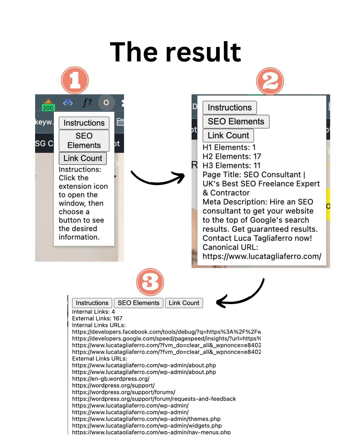 - "Fonctionnalité de l'extension Chrome : lorsque vous cliquez sur l'extension, une fenêtre apparaît. La fenêtre comprend un menu cliquable. Dans le menu, vous me montrez trois boutons. Le premier bouton me montre les instructions sur la façon d'utiliser l'extension. Dans le deuxième bouton, je vois le H1, H2, H3, le titre de la page, la méta description et l'URL canonique. Dans le troisième bouton, je vois le nombre de H1 et H2, le nombre de liens internes (y compris les URL).