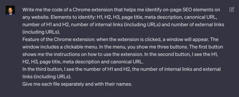 Maintenant que vous êtes prêt à demander une extension SEO potentielle, vous pouvez vous diriger vers ChatGPT pour écrire les instructions détaillées. Encore une fois, votre invite doit être aussi précise et détaillée que possible.