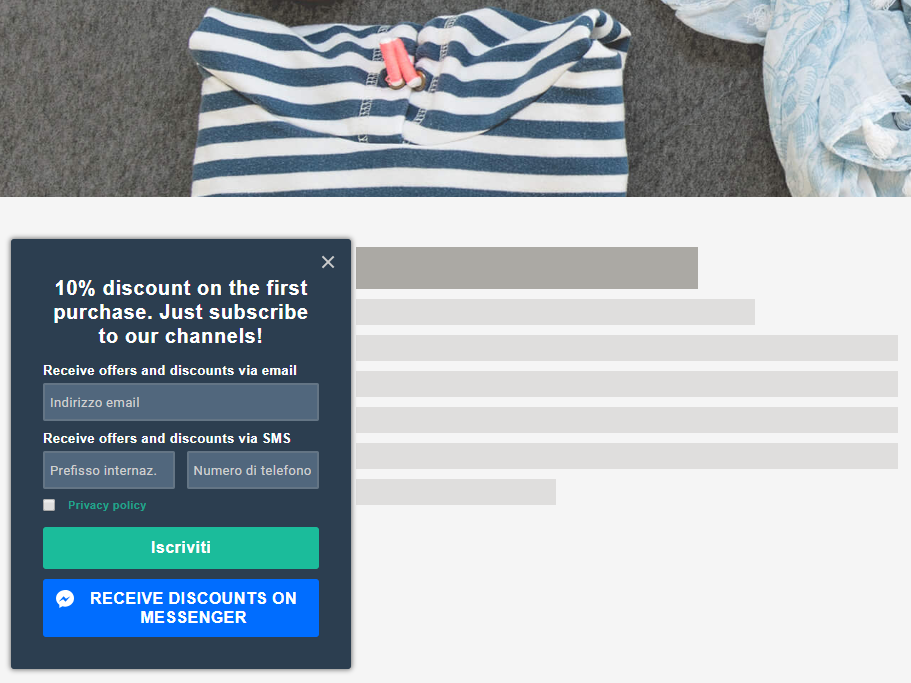 - Créez un formulaire pop-up avec l' éditeur MailUp . En quelques clics, ajoutez les champs Email, SMS et Messagerie, en choisissant entre Facebook Messenger et Telegram . Une fois que vous avez défini la mise en page du formulaire, l'éditeur génère le code que vous devez saisir avant de fermer la balise </body> de votre page, en page d'accueil, sur le blog ou là où bon vous semble. Voici un exemple de formulaire contextuel multicanal :