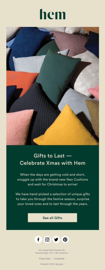 - Créez deux variantes de la campagne email : la première plus classique, avec un air de Noël ; la seconde plus originale en faisant référence au 25 décembre, sans les stéréotypes habituels (lumières, sapins, paquets et rubans), mais qui véhicule tout de même la chaleur de Noël. Voici un bon exemple: