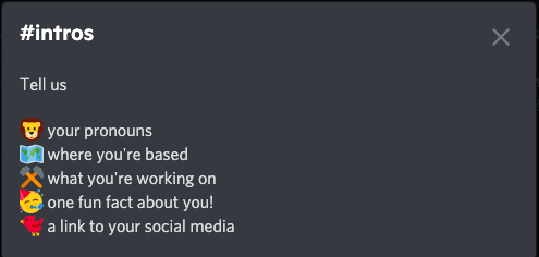 Encourager vos membres à se présenter dans un environnement confortable sans grand engagement via un fil d'introduction est un moyen simple et courant d'atteindre votre objectif. Personnellement, si l'intégration signifie que je n'ai pas besoin d'être en vidéo, alors c'est encore mieux, et je suis plus susceptible de sauter la tête la première.
