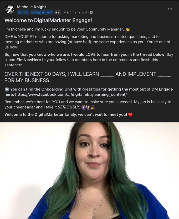 Je suis un grand fan de simplicité, j'ai donc une chouette vidéo de bienvenue avec un CTA dans notre groupe principal, DM Engage pour les membres du laboratoire. Je tague tous les nouveaux membres pour qu'ils interviennent et leur donnent juste une idée de ce dans quoi ils sont sur le point de s'embarquer.