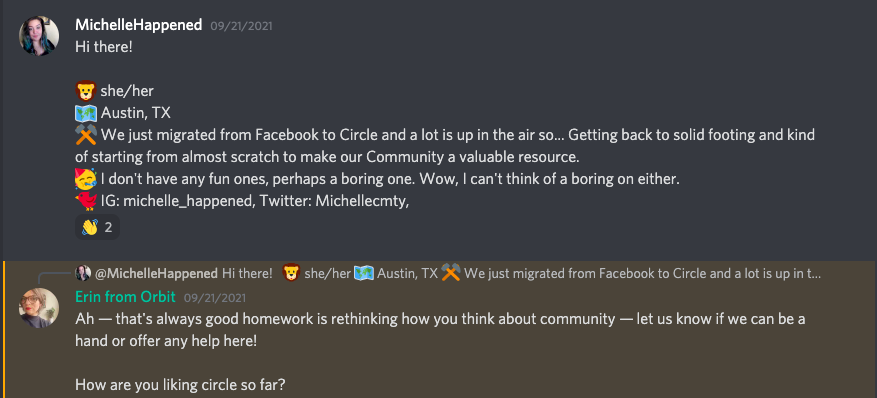 Vous pouvez créer un canal de discussion dédié aux présentations ou un post rituel qui accueille les nouveaux membres et encourage l'interaction. C'est génial pour une petite victoire; chaque victoire rend le désabonnement moins probable.