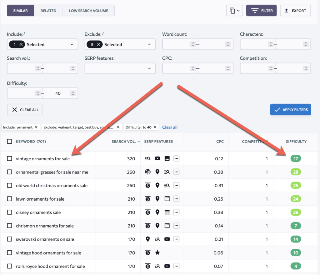 L'outil de suggestion de mots clés SE Ranking vous permet de rechercher ces nouvelles décisions d'achat en vous permettant de filtrer les mots avec lesquels vous ne pouvez pas rivaliser et de vous concentrer sur votre créneau. Vous pouvez également filtrer les résultats par difficulté pour trouver des requêtes de recherche avec une concurrence organique plus faible :