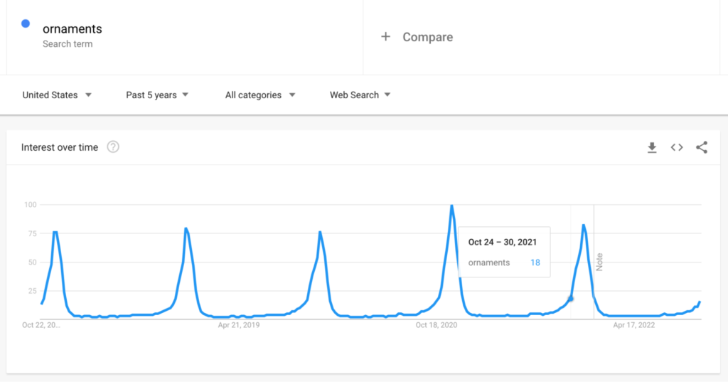 Google Trends est un autre excellent outil pour identifier le meilleur moment pour commencer votre contenu saisonnier et sa promotion. Par exemple, sur la base de cet outil, il semble que l'intérêt pour les "ornements" commence à croître régulièrement à la mi-octobre, année après année :