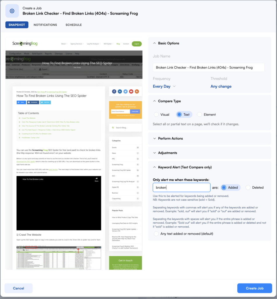 Un autre outil utile pour choisir votre timing est Visualping qui offre une fonction de surveillance SEO intéressante vous permettant de surveiller les pages de destination de vos concurrents pour être le premier à savoir quand ils mettent en place leurs promotions de vacances.