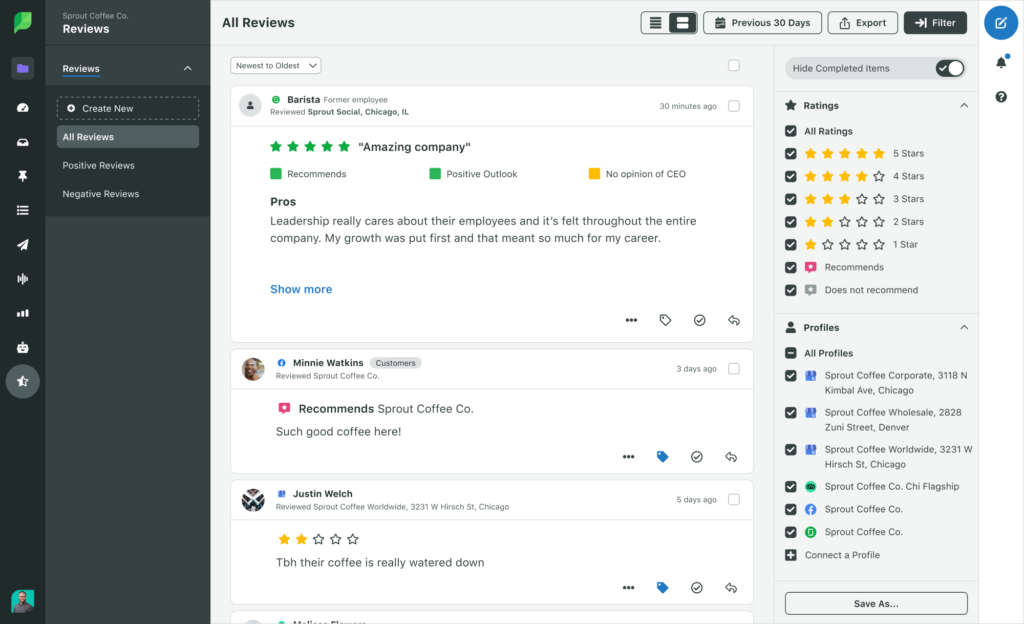Pour améliorer votre présence sur Glassdoor , surveillez régulièrement les avis et répondez rapidement au négatif comme au positif. Si vous utilisez Sprout, vous pouvez surveiller et répondre aux avis au fur et à mesure qu'ils arrivent à l'aide de notre outil de gestion des avis.