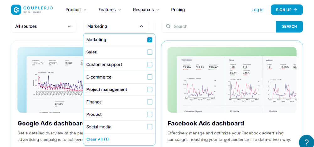Pour comprendre facilement les données, Coupler.io vous permet de créer des rapports et des tableaux de bord en temps réel. Il est possible d’approfondir facilement vos données marketing grâce à des exemples de tableaux de bord d’entreprise. Ils guident les utilisateurs pour chaque canal ou activité dont ils souhaitent afficher les résultats.