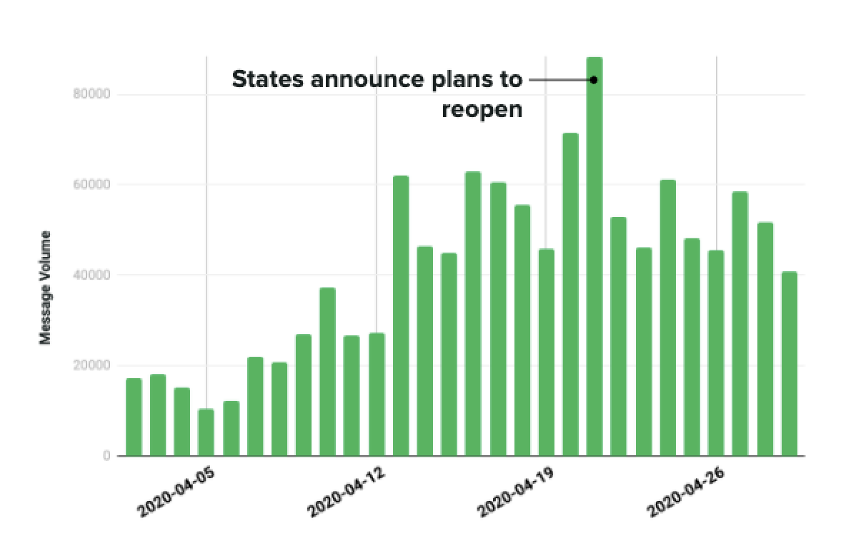 Mais après plusieurs semaines de quarantaine et d'ordonnances de maintien à domicile, les gens sont de plus en plus impatients de reprendre leur vie normale. Début avril, les conversations sociales autour de la fin du confinement ont pris de l'ampleur, augmentant de 268 % de mars à avril. De plus, les engagements dans les conversations «mettre fin au verrouillage» ont augmenté de 353% de mars à avril, le volume de messages culminant le 21 avril, le même jour, plusieurs États ont annoncé leur intention de rouvrir.