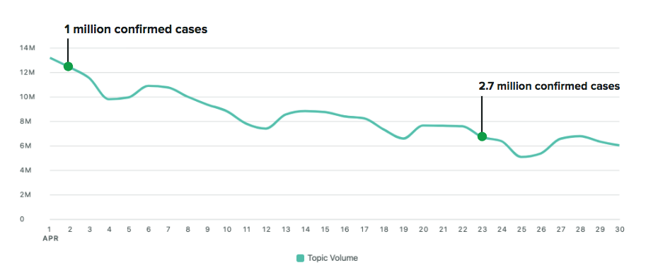 Au début de l'année, Twitter était rempli de conversations liées au fait de rester à la maison et au virus COVID-19. Mais de mars à avril, le volume de sujets autour de COVID-19 a chuté de 39 %, même si le nombre de cas confirmés a plus que doublé, passant d'un million à 2,7 millions.