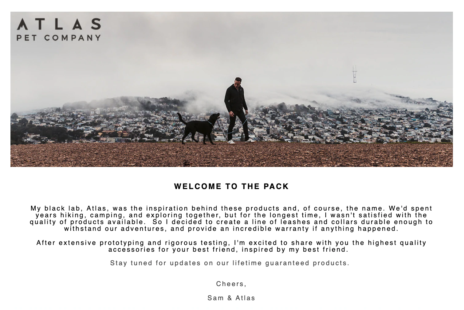 L'un de mes exemples préférés est celui du propriétaire d'une petite entreprise, Sam Alter, d'Atlas Pet Company. Le premier e-mail de la marque aux clients est signé par Sam et son laboratoire noir, Atlas, car ils ont fondé l'entreprise ensemble sur la base du besoin d'Atlas d'un meilleur équipement.