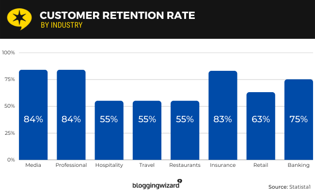 - Les médias et les services professionnels sont les industries avec le taux moyen de fidélisation de la clientèle le plus élevé à 84 %