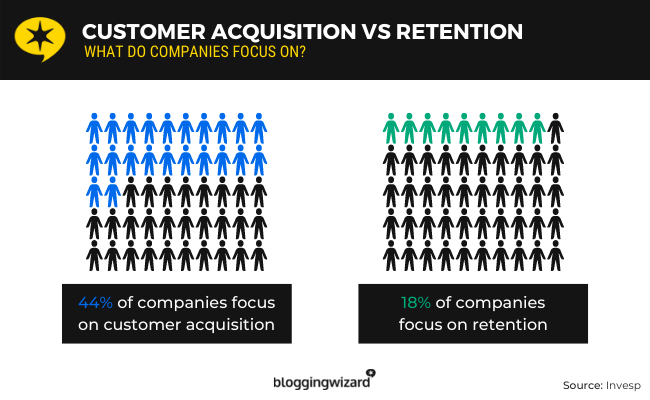 - 44% des entreprises se concentrent davantage sur l'acquisition tandis que 18% se concentrent davantage sur la rétention. (Invesp)