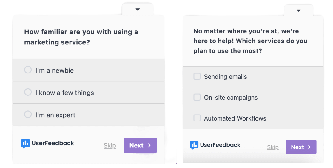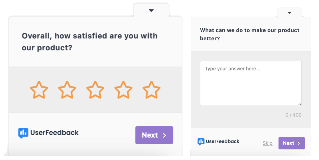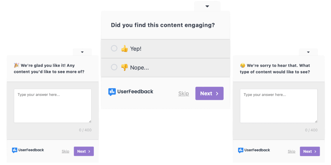 Jetez un coup d'œil à cet exemple impressionnant de sondage sur les commentaires des clients, créé avec notre outil de sondage en ligne préféré, UserFeedback. Cette enquête rassemble plusieurs types de données en utilisant des questions de suivi.