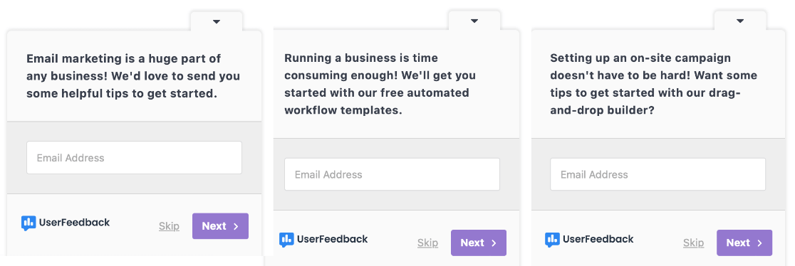 La troisième question est une mine d'or car selon la façon dont ils ont répondu à la question sur le produit, ils verront une question de capture d'e-mail personnalisée.