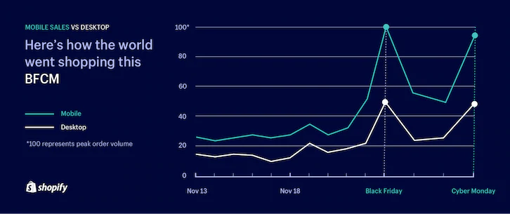 Les données de recherche montrent à quel point le mobile est important pour les achats des Fêtes : pendant le seul Black Friday Cyber Monday, 66 % des ventes des marchands Shopify ont été réalisées sur mobile.