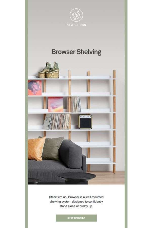 La campagne par e-mail de mise à jour des produits « Stack 'em up » de la marque pour la maison et la décoration Blu Dot est une excellence en matière de narration qui intègre le design dans le récit de leur produit amélioré.