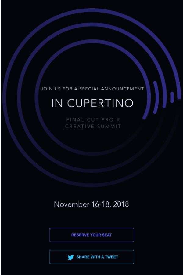 Un fond noir uni sert de toile de fond à un anneau de cercles bleu néon qui souligne le message d'invitation au Sommet créatif Final Cut Pro X.