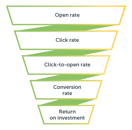 Concentrons-nous principalement sur les KPI on-mail , qui sont ceux qui font référence à l'interaction d'un utilisateur avec le message lui-même : un ensemble de données que l'on pourrait imaginer comme un entonnoir.