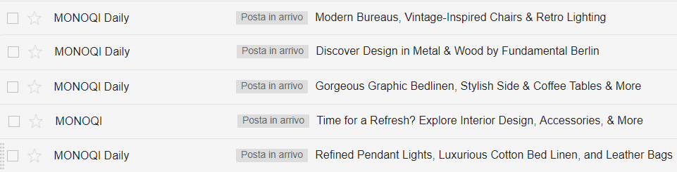 Voici quelques lignes d'objet des e-mails Monoqi qui, plutôt que de vendre, disent : chaque e-mail éclaire un type de design, un style spécifique pour une pièce de la maison.