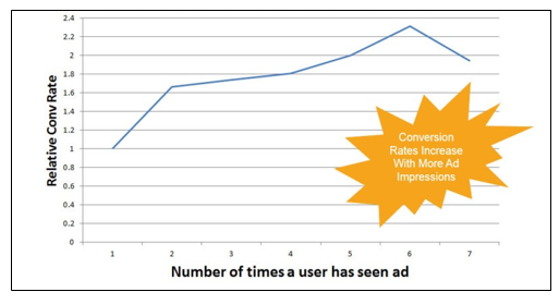 Plutôt que de spammer leurs boîtes de réception pour rester frais dans l'esprit des prospects, lancez des campagnes de remarketing afin que vos annonces apparaissent pendant qu'ils naviguent sur Internet (vous pouvez cibler tous ceux qui ont visité votre site !). Ces publicités sont moins intrusives que les e-mails et se sont avérées incroyablement efficaces. Comme vous pouvez le voir ci-dessous, plus quelqu'un voit ces publicités, plus il est susceptible de réaliser une conversion.