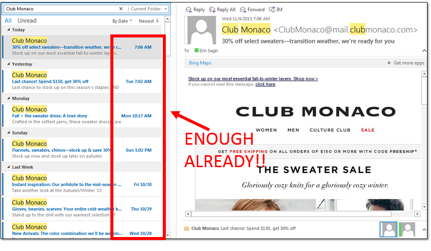 Aussi tentant qu'il soit d'inonder les boîtes de réception de vos prospects d'offres, cela ne vous rapporte généralement qu'une étiquette "désabonnement" ou "passer automatiquement au courrier indésirable". En fait, j'ai refusé de parler aux vendeurs qui encombrent ma boîte de réception, même si j'étais à l'origine complètement enthousiaste à propos de leur produit. Cela dit, les données montrent que les gens sont plus susceptibles de poursuivre un achat s'ils voient le nom d'une marque à plusieurs reprises. Cela crée un défi difficile pour les spécialistes du marketing par e-mail, qui cherchent désespérément à garder leurs marques en tête des prospects sans les rendre fous.
