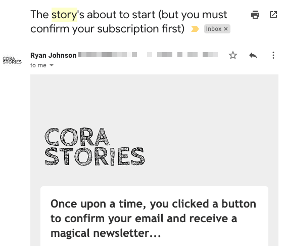 "L'histoire est sur le point de commencer (mais vous devez d'abord confirmer votre abonnement)." Cora Stories vous dit à quoi vous attendre (vous êtes sur le point de recevoir votre histoire) et ce que vous devez faire en premier (confirmez votre e-mail pour recevoir la newsletter)