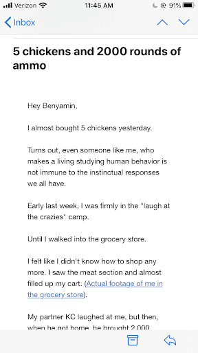 Cela vient de la rédactrice Abby Woodcock, et cela commence par une histoire : "J'ai presque acheté cinq poulets hier." Cette ligne d'objet utilise 2 des leviers de la curiosité : la surprise et laisser une histoire inachevée.