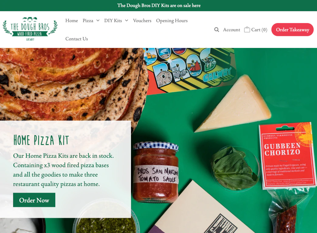 The Dough Bros est une pizzeria au feu de bois située à Galway, en Irlande. Pour les clients qui ne peuvent pas se rendre au restaurant, tThe Dough Bros propose des kits de pizza prêts à l'emploi qui sont livrés avec toutes les garnitures et sauces pour faire les tranches de signature de la marque à la maison.