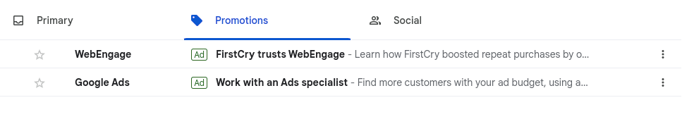 Les annonces Discovery sont affichées dans l'onglet Promotions ou Réseaux sociaux du flux Gmail (dans votre boîte de réception e-mail) :