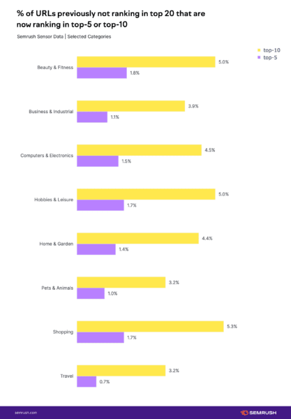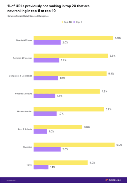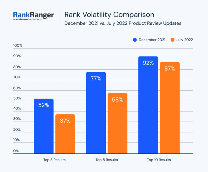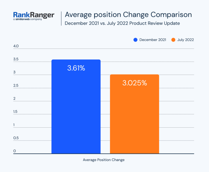 Le changement de volatilité des classements entre la mise à jour des avis sur les produits de juillet 2022 et la mise à jour des avis sur les produits de mars 2022, les données montrent que les augmentations sont minimes. Certaines niches "n'ont même pas augmenté d'un point complet, le taux de fluctuation le plus élevé enregistré par le capteur Semrush lors de la mise à jour", a ajouté Mordy Oberstein.