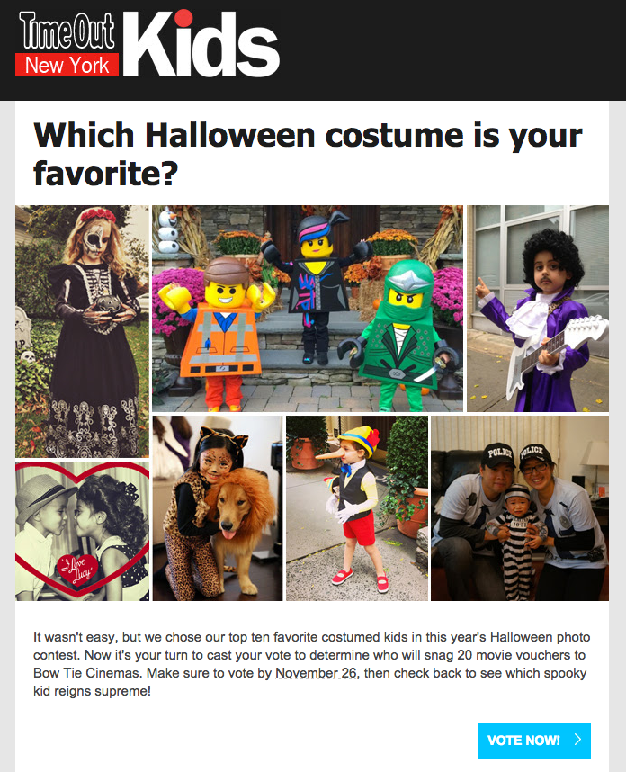 L'année dernière, Time Out New York a invité les lecteurs à voter pour les costumes d'Halloween, en leur offrant des bons de cinéma en récompense. Quelle belle incitation à l'action ! C'est un bon répit par rapport aux CTA de vente ou promotionnels habituels, offrant aux lecteurs quelque chose d'amusant à faire. De plus, le contenu est généré par l'utilisateur, donc non seulement il est engageant, mais il donne à Time Out l'opportunité de faciliter une connexion authentique avec les lecteurs tout au long de leur vie. Choisissez un hashtag stratégique, des récompenses alléchantes et une idée accrocheuse sur le thème des vacances pour commencer à planifier votre propre campagne de contenu généré par les utilisateurs !