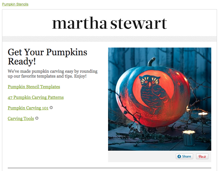 Martha Stewarts offre aux abonnés des pochoirs de citrouille imprimables, un contenu facile à partager qui va au-delà de la publication habituelle de « comment faire ». Offrir une gâterie gratuite et utilisable au bon moment, conforme à la marque et dans l'esprit des Fêtes engage les lecteurs et encourage l'ouverture d'e-mails. Donner du contenu aide également les marques à se positionner positivement, ainsi qu'à découvrir et à développer leur audience. Faites preuve de créativité avec ce que vos abonnés apprécieraient vraiment, comme un ebook gratuit à télécharger, un coupon ou une infographie imprimable, et offrez-le !