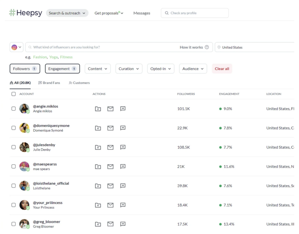 Cette plate-forme prend en charge le sourcing de créateurs sur Instagram, TikTok et YouTube sur tous les plans de paiement. Heepsy se concentre davantage sur l'élément de recherche du marketing d'influence, y compris des fonctionnalités axées sur la recherche d'influenceurs, la recherche d'influenceurs, les statistiques d'influenceurs et les listes d'influenceurs. Avec des fonctionnalités telles qu’une analyse d’authenticité, ils facilitent la recherche d’influenceurs de qualité avec lesquels s’associer.