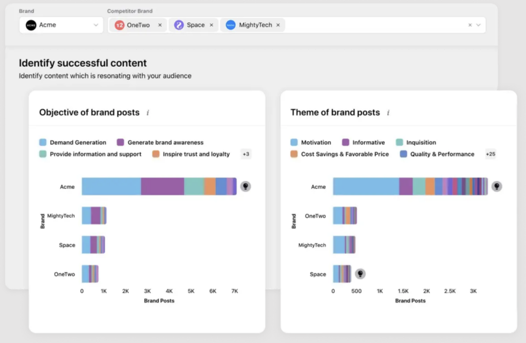 Leurs outils peuvent faire apparaître des phrases et des sujets qui stimulent l'engagement social dans votre contenu, vous aidant ainsi à l'optimiser. La fonction d'analyse du type de publication vous aide à voir les engagements par différents types de médias et de publications. Et des tableaux de bord ou modèles personnalisés vous aident à présenter vos données comme vous le souhaitez.