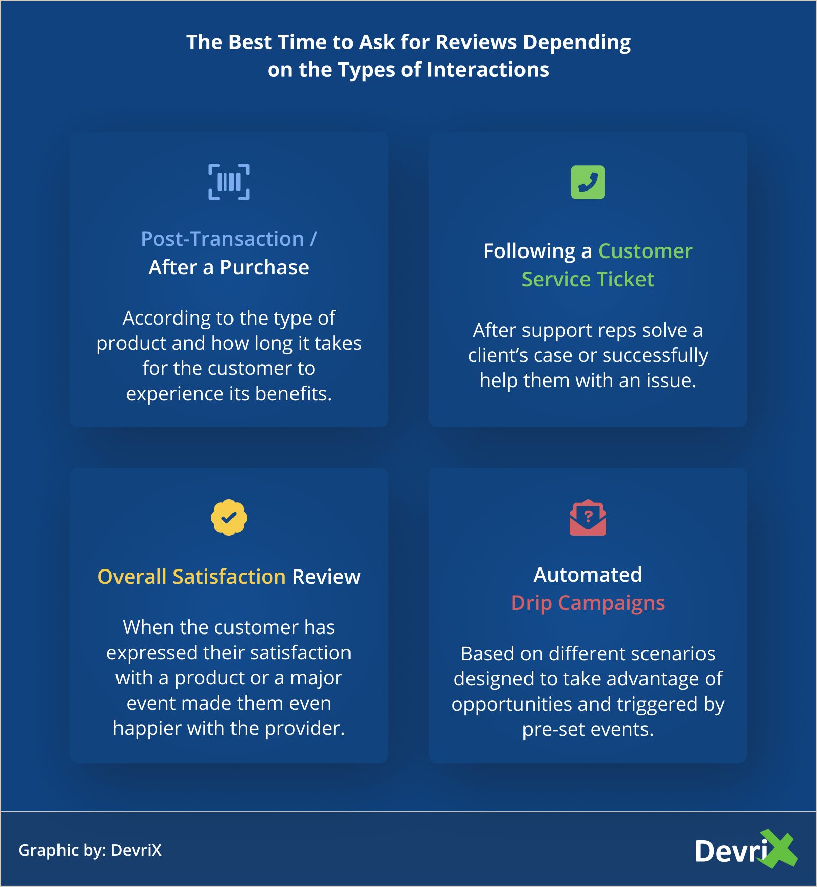 Il est préférable de choisir un moment où le client a exprimé sa satisfaction à l'égard de votre produit pour l'inviter à écrire ses réflexions, afin que les autres sachent que vous êtes un partenaire fiable.